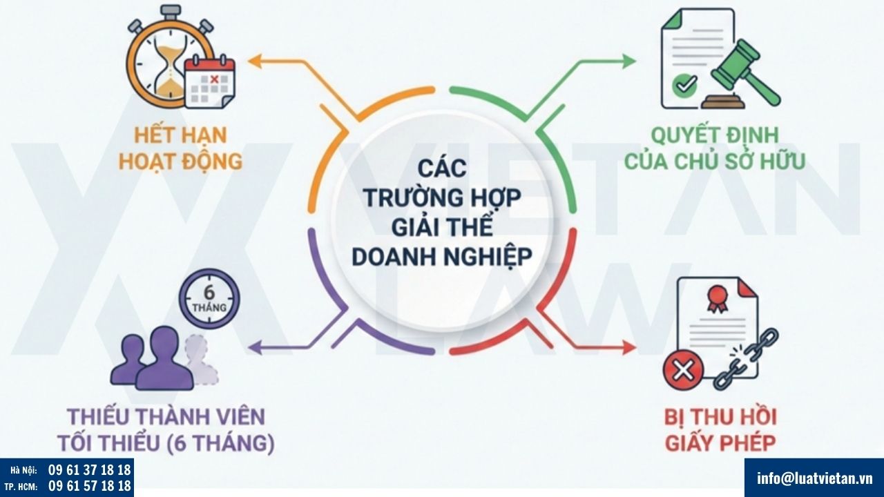 – Hết thời hạn hoạt động – Quyết định của chủ doanh nghiệp/công ty; – Không đủ số thành viên tối thiểu theo luật; – Bị thu hồi Giấy chứng nhận đăng ký doanh nghiệp. |