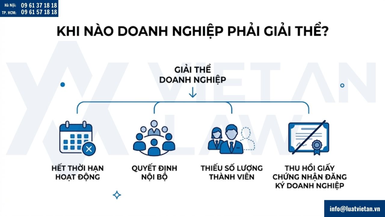 Theo quy định của pháp luật doanh nghiệp, doanh nghiệp phải thực hiện thủ tục giải thể khi chấm dứt hoạt động và không còn nhu cầu tiếp tục kinh doanh. Một số trường hợp phổ biến dẫn đến việc giải thể doanh nghiệp bao gồm: