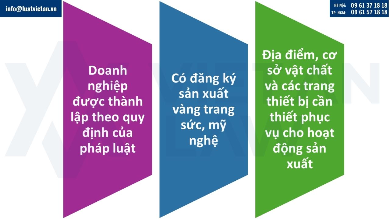 Về cơ sở vật chất – kỹ thuật: Có địa điểm, cơ sở vật chất và các trang thiết bị cần thiết phục vụ cho hoạt động sản xuất vàng trang sức, mỹ nghệ.