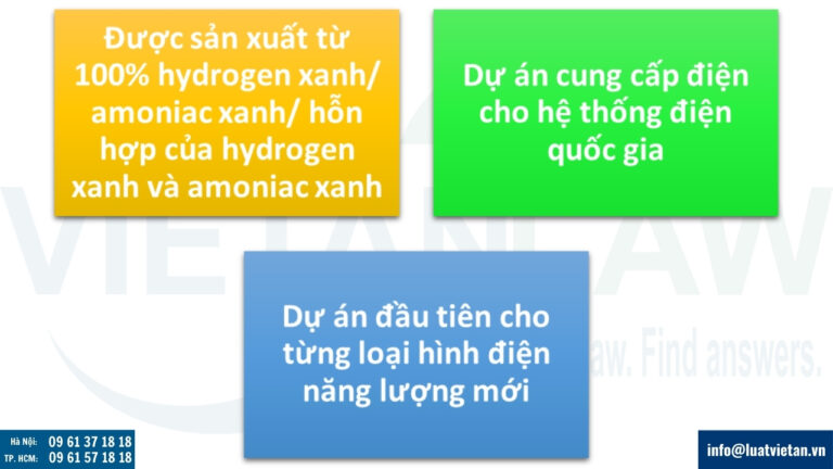 Dự án điện năng lượng mới được sản xuất từ 100% hydrogen xanh hoặc 100% amoniac xanh hoặc 100% hỗn hợp của hydrogen xanh và amoniac xanh;