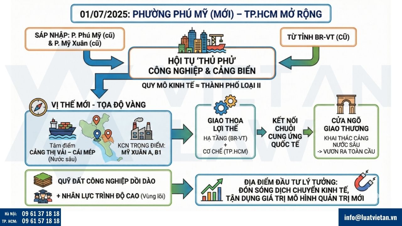 Kể từ ngày 01/07/2025, phường Phú Mỹ chính thức được hình thành trên cơ sở sáp nhập phường Phú Mỹ và phường Mỹ Xuân từ tỉnh Bà Rịa – Vũng Tàu cũ để trở thành một phần của Thành phố Hồ Chí Minh mở rộng. Quá trình sáp nhập này không chỉ đơn thuần là sự cộng dồn về diện tích mà là sự hội tụ của hai “thủ phủ” công nghiệp và cảng biển, tạo nên một đơn vị hành chính có quy mô kinh tế tương đương một thành phố loại II trước đây.