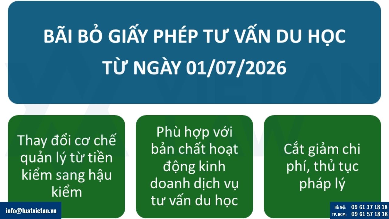 Thay đổi cơ chế quản lý từ “tiền kiểm” sang “hậu kiểm”: Trước đây, nhà nước quản lý ngành, nghề kinh doanh bằng việc kiểm tra các điều kiện kinh doanh và cấp giấy phép kinh doanh cho doanh nghiệp. Nhưng thực tế cho thấy, việc thẩm định điều kiện kinh doanh hiện nay chủ yếu mang tính hình thức mà không đảm bảo chất lượng dịch vụ. Thay vào đó, bãi bỏ Giấy phép du học giúp doanh nghiệp gia nhập thị trường dễ dàng hơn nhưng nhà nước sẽ tăng cường kiểm tra, giám sát quá trình hoạt động và xử lý vi phạm nghiêm ngặt hơn nếu có gian lận